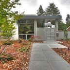 Dark metal windows, smooth-faced stucco, wood siding, exposed masonry and a standing seam roof provide a clean, durable envelope. Interiors are kept simple with wood flooring and white paint serving as a backdrop for wood and steel casework. JLC Architecture provided a full architectural and interior design package.