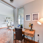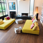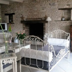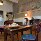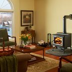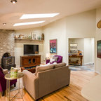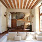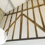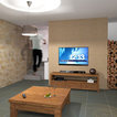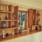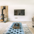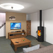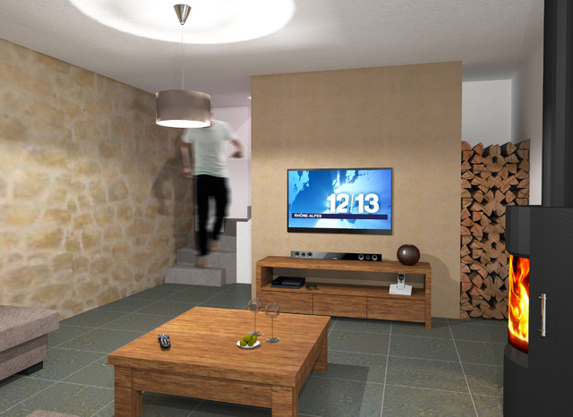 Cette cloison permet d'intégrer la télévision et créer un espace rangement pour le bois, pratique et déco.