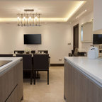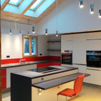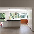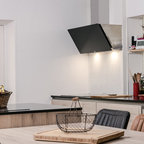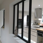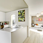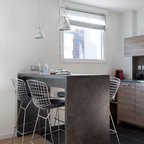 Her er en anden version af rå stenvægge, der nærmest leder tankerne hen på en gammel slotsruin. Køkkenet i stål giver virkelig en markant kontrast til væggene, og det skaber masser af dynamik i rummet.