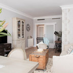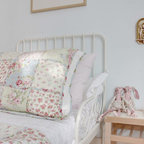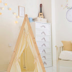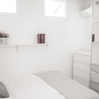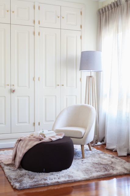 “En la zona de vestidor, una alfombra de pelo largo y cortinas que bailan a ras de suelo acaban de darle forma al conjunto”, cuenta la profesional sobre este dormitorio bonito y práctico.