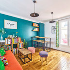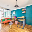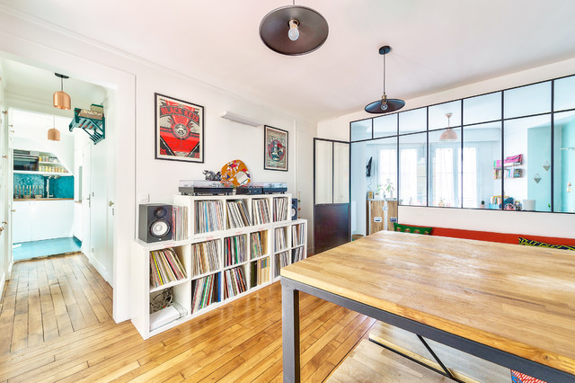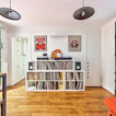 Un coin réservé aux vinyles du client ! Fan de musique, les cds, les platines, les hauts-parleurs, participent au look éclectique de l'appartement ! Hipster et exotisme ! Original !