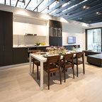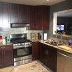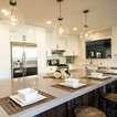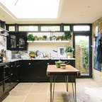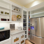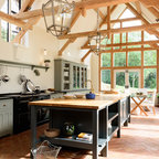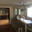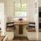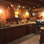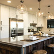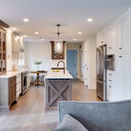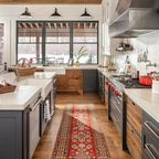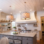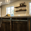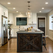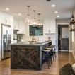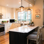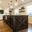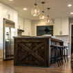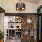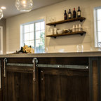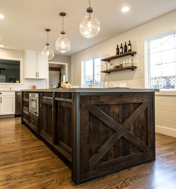 Modernized farmhouse-style kitchen with white shaker cabinets, subway tile, glass teardrop pendants, shiplap with floating shelves and a completely custom reclaimed wood island. We transformed this space by removing the wall between the kitchen and dining room to create a much more open and inviting kitchen. The island is made of redwood from an old barn in Livermore, CA, with custom steel trim work and barn door hardware made by Ridgecrest.