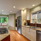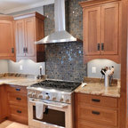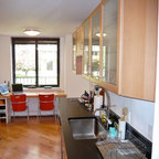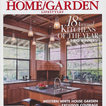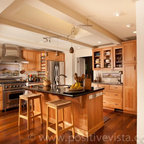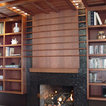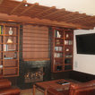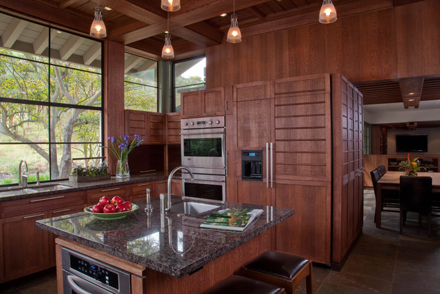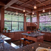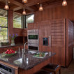 Kitchen with garden view. The kitchen is a wood box, paneled in quarter-sawn red oak, with an articulated red oak ceiling and cabinetry. A copper gray slate tile floor compliments the warm tones of the woodwork. The countertops are Bahia Brown granite.