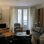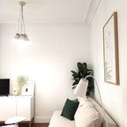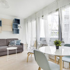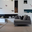 De jolies niches horizontales et verticales, de tailles et de couleurs différentes, disséminées ça et là sur un mur blanc, font tout le charme de cette belle pièce à vivre en blanc, beige et gris. Bougies, cadres photos, bûches… Elles mettent en valeur tous les éléments qui les habitent.