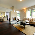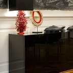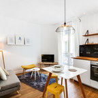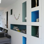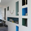 Apporter de la couleur au salon De jolies niches horizontales et verticales, de tailles et de couleurs différentes, disséminées ça et là sur un mur blanc, font tout le charme de cette belle pièce à vivre en blanc, beige et gris. Bougies, cadres photos, bûches… Elles mettent en valeur tous les éléments qui les habitent.