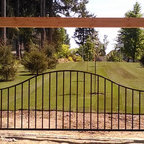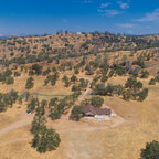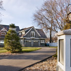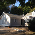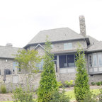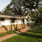 view of back of house, stone patio, add fireplace to back left side. Add windows to enclosed arch from interior, enclose to regular windows with black trim Door to back right going out to patio.