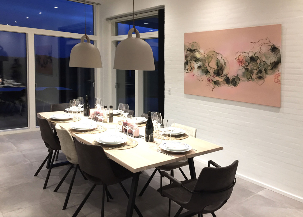 Indretning med moderne kunst. Stort maleri i spisestue der bringer farve og liv ind i det lyse rolige rum, der er indrettet enkelt i en nordisk stil.