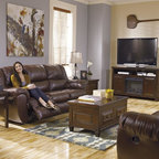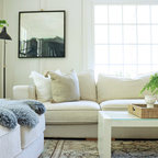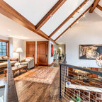 I like the multiple uses for the media area- tables and bench and the large photos flanking the TV