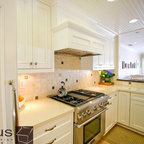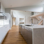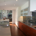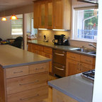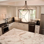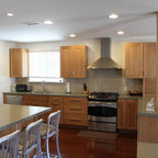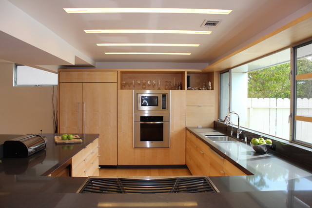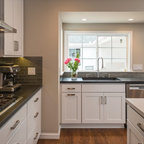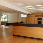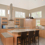 Kitchen opens to living, dining, and family rooms. Cabinetry is done in quarter-sawn maple with dark grey Caesarstone countertop.