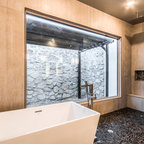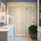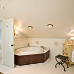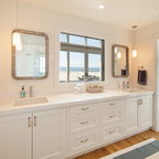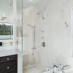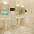 Master bath has his and her lavatories on opposite sides of space.