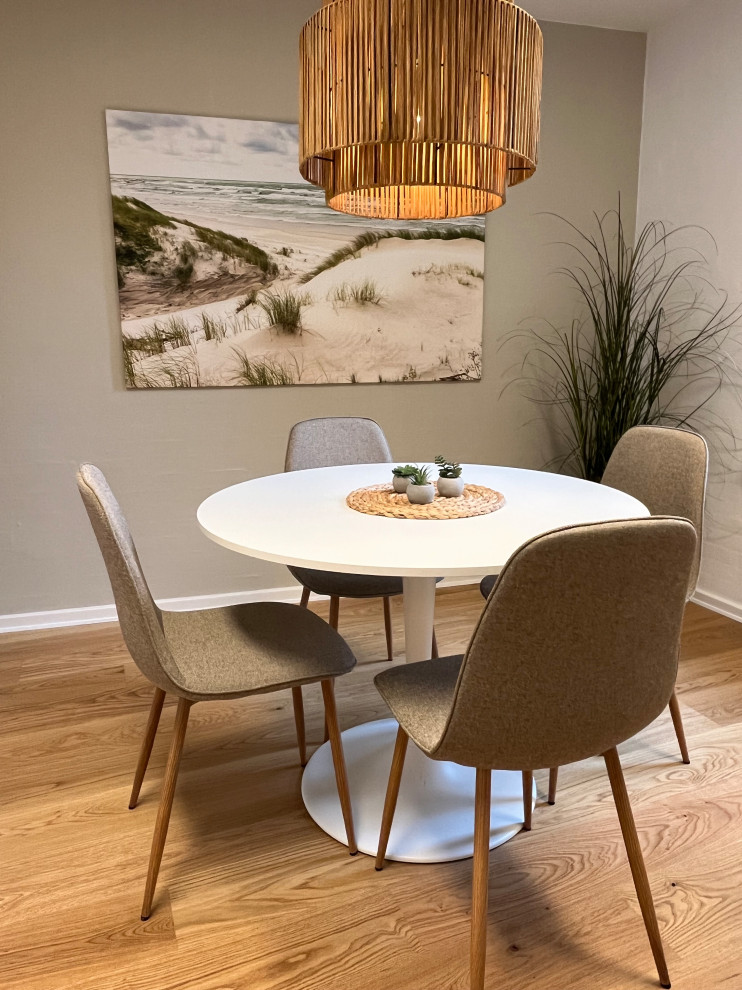 Lille spiseplads i en varm, lys og indbydende strandtema til klinikkens frokoststue.