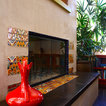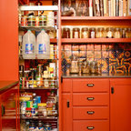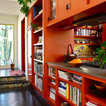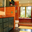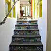 colours + tiles along stairs + large black tiles and orange storage with tiles