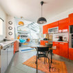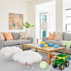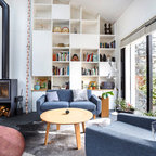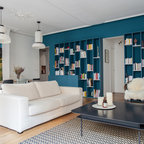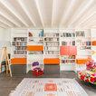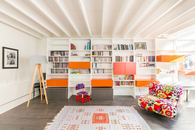 Le mur du fond du salon est animé par une vaste bibliothèque fabriquée sur mesure pour s’étendre sur 9 mètres de long. Le couple, qui voulait des étagères où ranger ses livres et des rangements cachés a fait appel, ici aussi, à Arno Maurer et Jacques Obadia. Si la structure blanche se fond dans le décor pour atténuer l’allure massive de la structure, des caissons colorés apportent du rythme et de la fantaisie. En plus du canapé gris depuis lequel la photographie est prise, le salon est occupé par un large fauteuil aux courbes généreuses et au motif floral pop. Au sol, un somptueux tapis kilim, déniché à Taroudant, au Maroc, réchauffe l’espace. Une petite chaise pour enfant achève une atmosphère joyeuse, propice à d’agréables moments en famille.Fauteuil : Pop, collection capsule Kartell x Missoni