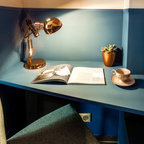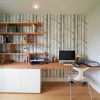 Idée décoration avec petite bibliothèque encastrée et petit placard sous fenêtre avec étagère dans le prolongement sur mur perpendiculaire....