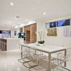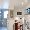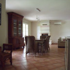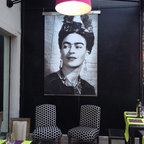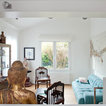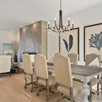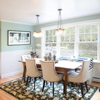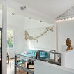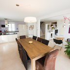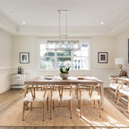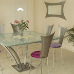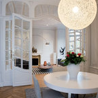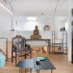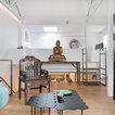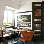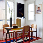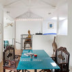Mariage réussi et harmonieux de chaises chinoises d'époque et d'une table contemporaine Constituée d’un plateau en verre bleu posé sur des tréteaux en métal, la table vient de chez Habitat. « Déjà existantes, ces chaises chinoises d’époque devaient être intégrées. » Leur structure complexe et très travaillée rompt paradoxalement mais harmonieusement, avec la simplicité de la table, beaucoup plus contemporaine.