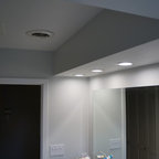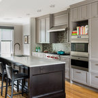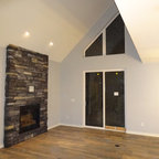 The most noteworthy quality of this suburban home was its dramatic site overlooking a wide- open hillside. The interior spaces, however, did little to engage with this expansive view. Our project corrects these deficits, lifting the height of the space over the kitchen and dining rooms and lining the rear facade with a series of 9' high doors, opening to the deck and the hillside beyond.