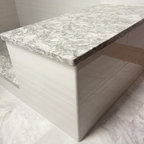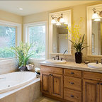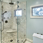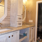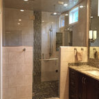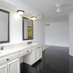 We utilized a Moroccan inspired mirror to accentuate and play with the unusual slanted roof line. By adding clean lines and ample drawers for storage, we were able to transform this outdated bathroom into a true modern master retreat.