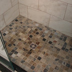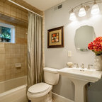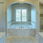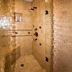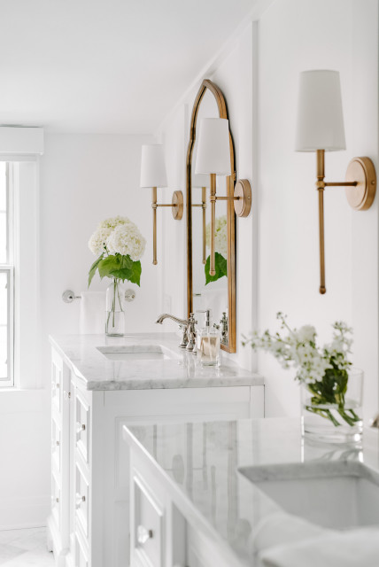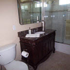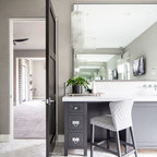 We utilized a Moroccan inspired mirror to accentuate and play with the unusual slanted roof line. By adding clean lines and ample drawers for storage, we were able to transform this outdated bathroom into a true modern master retreat.
