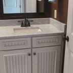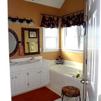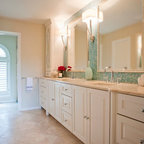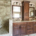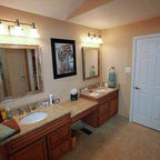We utilized a Moroccan inspired mirror to accentuate and play with the unusual slanted roof line. By adding clean lines and ample drawers for storage, we were able to transform this outdated bathroom into a true modern master retreat.