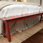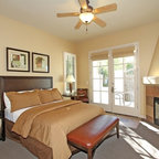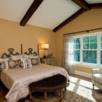 Like the side table and bed color (Very neutral and not too yellow) Also like the bench at the end of the bed. Like the modern lamp with the traditional beside table. Love the play of patterns and textures on the pillows.