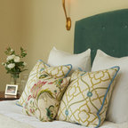 Love colors of bedroom and the picture grouping with wall sconces