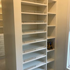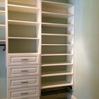 Drawers and open shelves for Mike’s closet, shoe shelves in corner