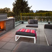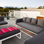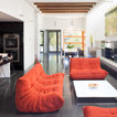 Les Togo en Alcantara rouge orangé qui apporte beaucoup de chaleur sur le sol en carrelage gris anthracite.