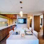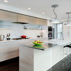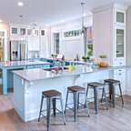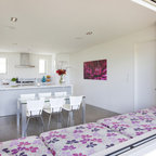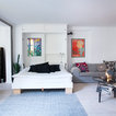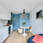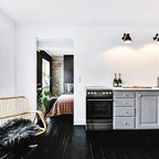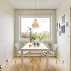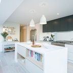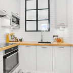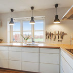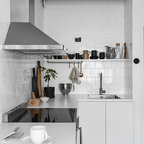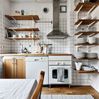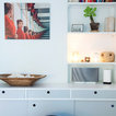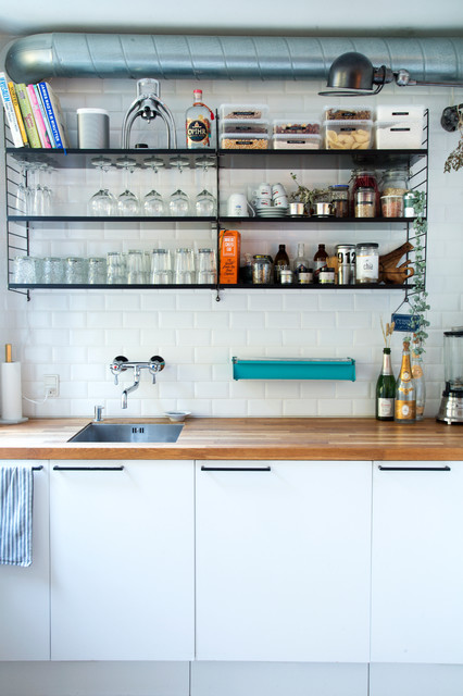 Ned med overskabeneHvis du synes, dit køkken er alt for kedeligt med sin hvide base, kan du tage dine overskabe ned og sætte en række hylder op, hvor du kan stille diverse køkkensager - det giver liv til rummet og fjerner fokus fra det hvide, måske lidt almindelige køkken.