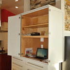 Pull out drawers create accessible storage solution in a tall pantry cabinet.