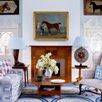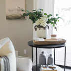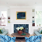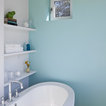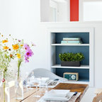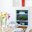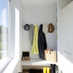 “Lad ikke maleriet eller gallerivæggen gå over dørens overkant. I det her tilfælde er den store blå trekant op til kippen vigtig at bevare. Det er jo en virkelig smuk væg med en god form og en lækker farve. Det vigtigste er ikke at bryde fladerne for meget og ikke kontraste alt for meget,” siger indretningseksperten fra Homesweetspot.Se også: Kan man have vaskerum på førstesal?
