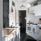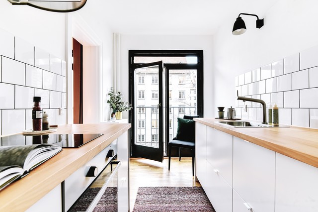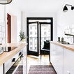 Sort og hvidtKontraster, kontraster, kontraster. Det kan ikke understreges, hvor vigtigt det er at skabe kontrast i et køkken, selv om du ønsker en enkel og rolig stil. Spillet mellem sort og hvid er en nem måde at skabe dynamik i køkkenet. Her med hvide fliser og sorte fuger, hvide vægge og en sort altandør og sorte arkitektlamper på væggene.