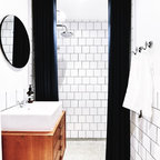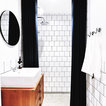 Black door. Square subway tile with dark grout.