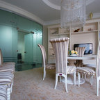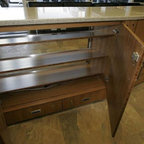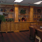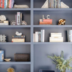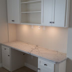 Wall/desk combo in contrasting colors: teal wall background with built in white open shelving and base cabinets
