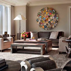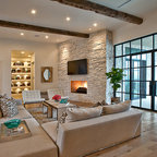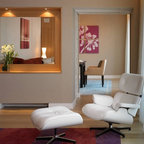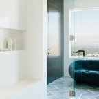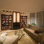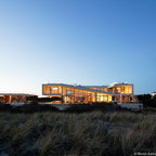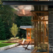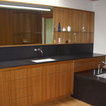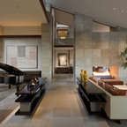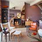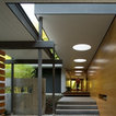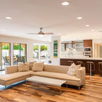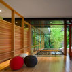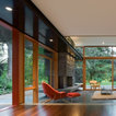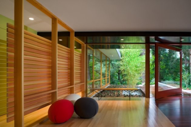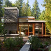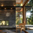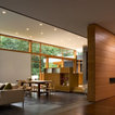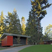 A concrete wall links a new music studio and detached garage to the main house, forming an entry court that welcomes visitors and screens the private bedroom spaces nearby. The entry is marked by a series of round skylights, while the living room has been opened up with taller ceilings, a new fireplace and walls of glass. A series of long colored boxes provides storage and utility spaces, while planar elements draw the eye through the house to the landscape beyond. Teak cabinets, blackened steel and Douglas fir contrast with more modest materials such as painted MDF panels, fiber-cement siding and painted gypsum wallboard. These spaces are designed to accommodate both intimate family gatherings and large parties.