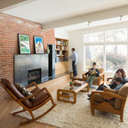 Located on a wooded site, a single-story 1950s house with an awkward floor plan was strategically remodeled to provide living spaces that connect to the outdoors and respond to the needs of a young family.