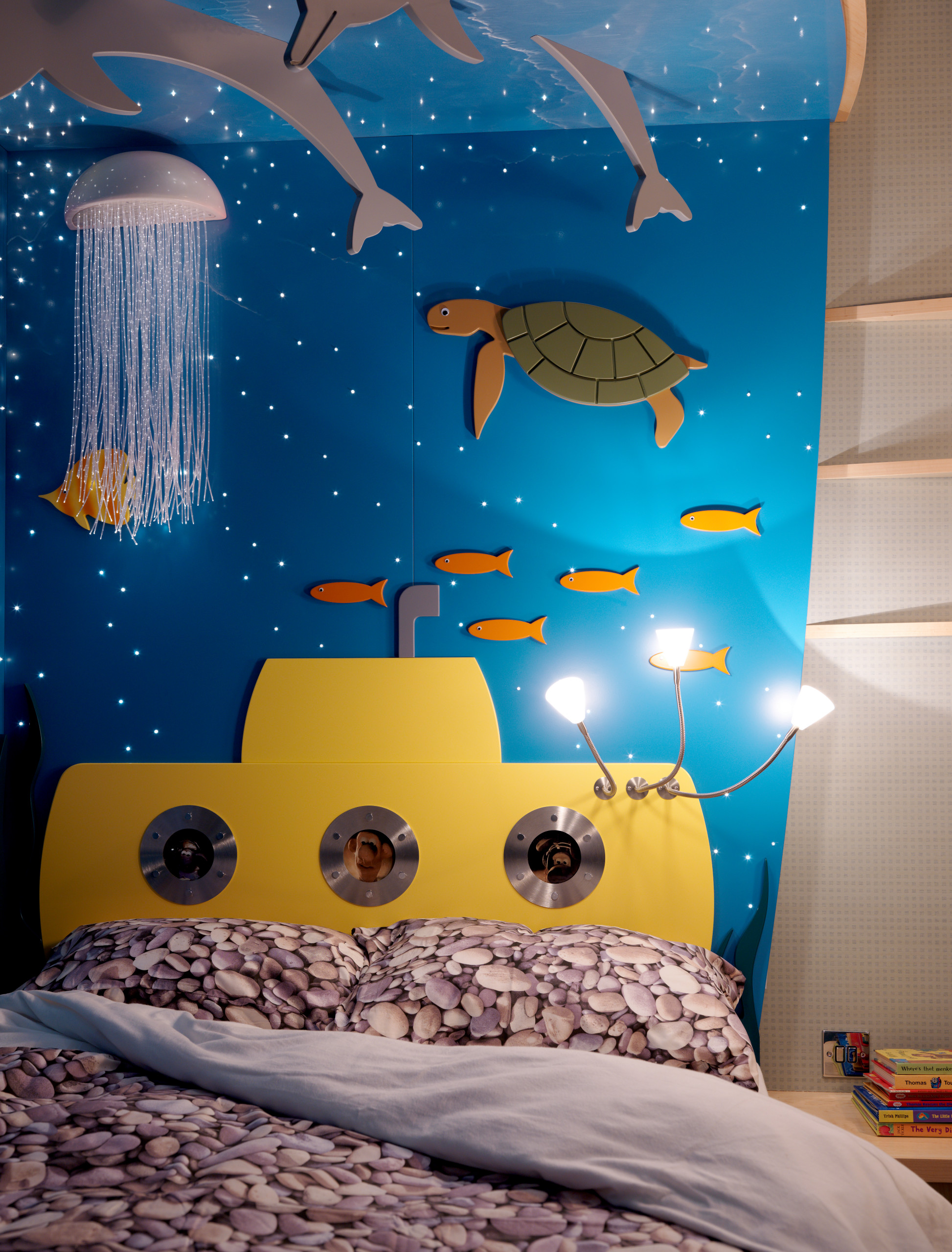 En u-båd som seng og havet som baggrund? Der er ingen tvivl om, at dit barn vil elske dig for at gå all-in på dekorationer i legeværelset. Et temaværelse kan sommetider være nok til at inspirere barnet til at bruge sin fantasi. Det er slet ikke sikkert, at der er behov for alverdens tingeltangel eller fysisk legetøj - fantasien i sig selv får nemlig frit løb og lov til at udfolde sig kreativt. Find nogle fine figurative elementer, og placér disse rundt omkring i værelset. Brug gerne væggene, fra gulv til loft, og dekorér så meget som muligt. På denne måde bliver temaet mest gennemført og legende at se på.