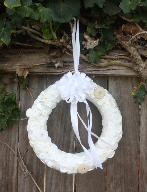 Det er altid hyggeligt at hilse sine gæster velkommen med en julekrans på hoveddøren. Her kan du istedet for gran vælge helt andre materialer i hvid. Denne dørkrans er lavet af hvide knapper i forskellige farver og størrelser sat fast på en skumgummiring med et hvidt bånd i toppen. Er du mere til grankranse, kan du også prøve at spraymale kransen med hvid maling.