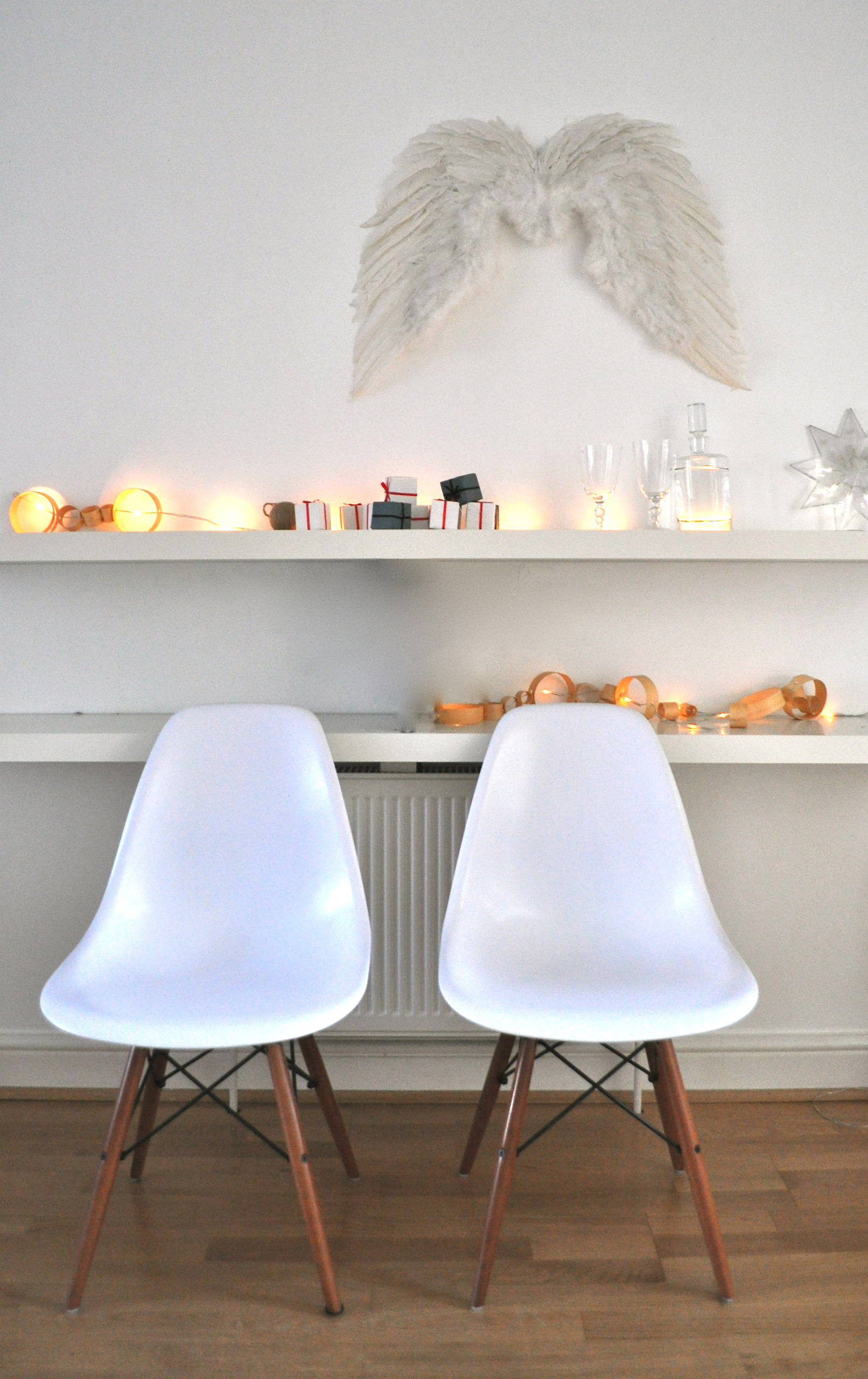 Har du hvide møbler i din bolig, kan du vælge at integrere dem i juleudsmykningen. Her har man kombineret et par hvide Eames-stole i plast med et par englevinger på væggen og små hvide julegaver på hylderne. Julepynt, som du med garanti ikke bliver træt af i december.