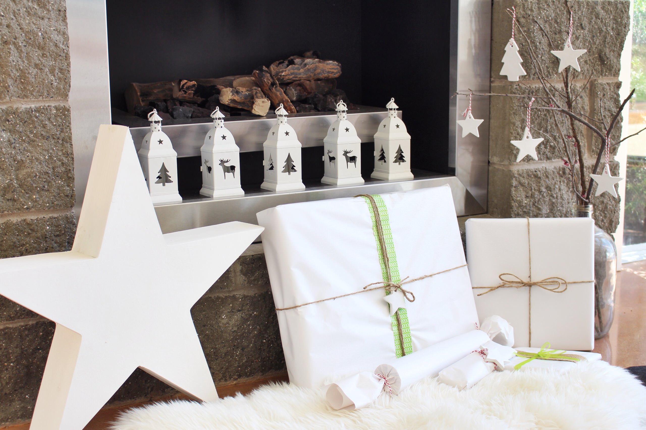 Har du allerede en nordisk-inspireret indretningstil, er det nemt at pynte minimalistisk op. For det er ikke altid nødvendigt at bruge nisser og gran til at understrege julen. Her har man eksempelvis lavet et stemningsfyldt hjørne med hvide lanterner, hvidt fåreskindstæppe og små ståltrådshjerter, der hænger på grene i baggrunden. Det er en nem og hyggelig udsmykning, hvor du kan bruge dine almindelige dekorationsgenstande til at pynte op med.