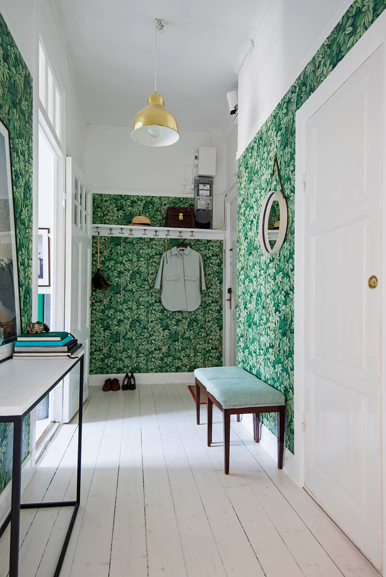 “Man ser fyrretræ som gulvbelægning de fleste steder, og det kan enten males med en slidstærk gulvmaling, eller man kan lade den stå med patina fra mange års brug. Et linoleumsgulv er også praktisk og fås i mange forskellige sorter og farver. En lang løber i gangens fulde længde vil desuden samle de mange døre i gangen visuelt,” siger Mick Bergenhammer. Han fortæller yderligere, at et væg-til-væg-tæppe også kan være en dejlig blød løsning på gulvet i gangen, når man smutter mellem de forskellige rum.