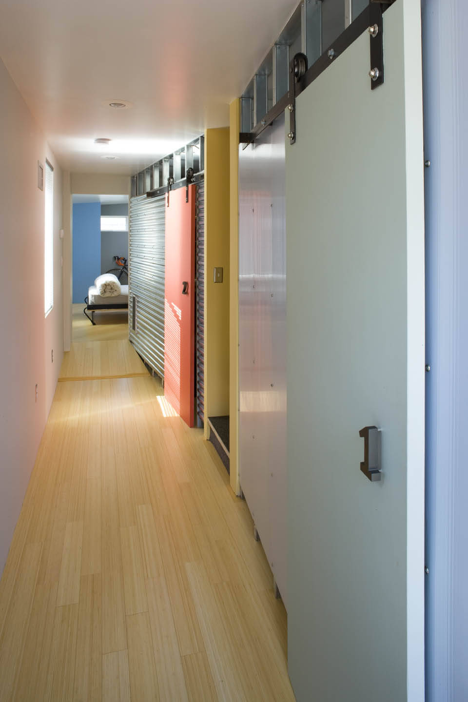 Arkitekt Jørgen Knippel foreslår en løsning, der samler gulvet og de mange døre i den lange gang. “Man kan opdele gulvet med farvepletter, der matcher dørene. Hvis man ikke er så sart, kan man endda give dem lidt spræl. Derudover kan man dekorere dørene med navne eller anden tekst med store, flotte bogstaver,” siger Jørgen Knippel.