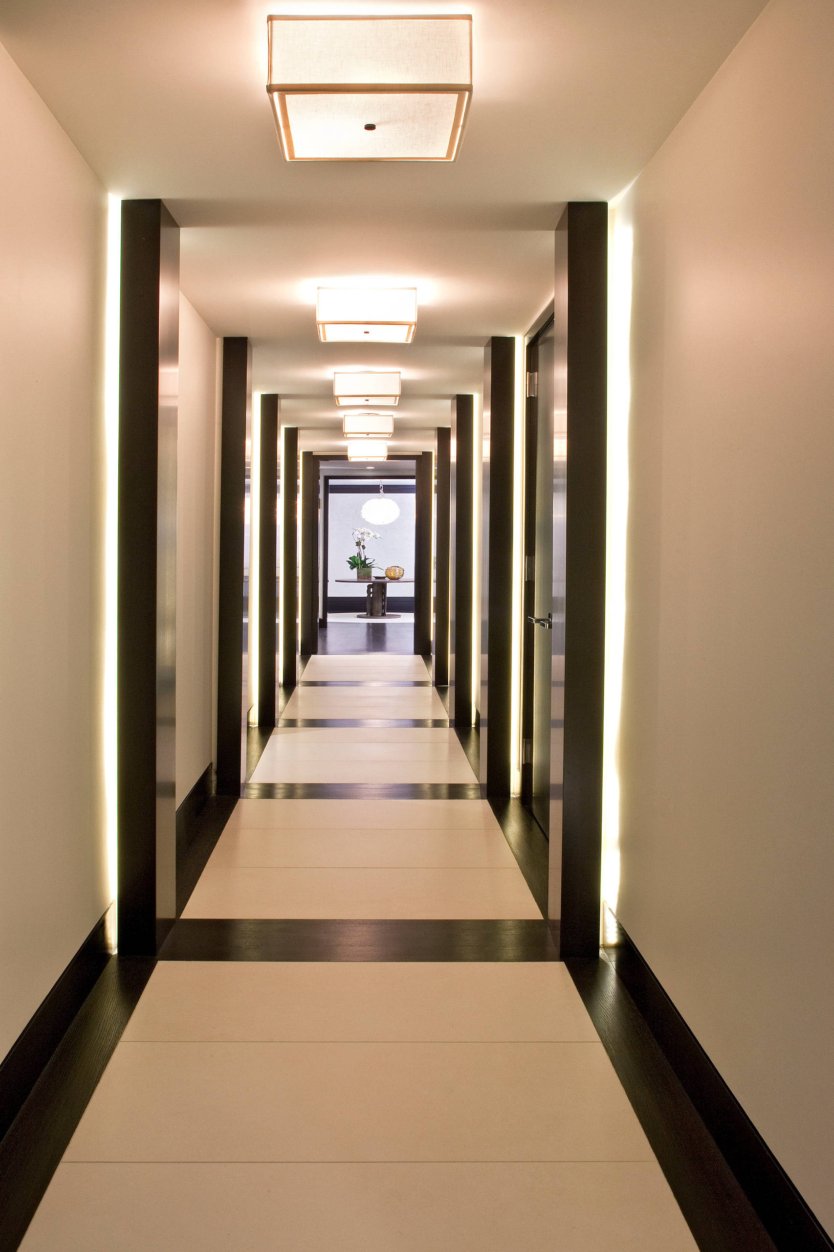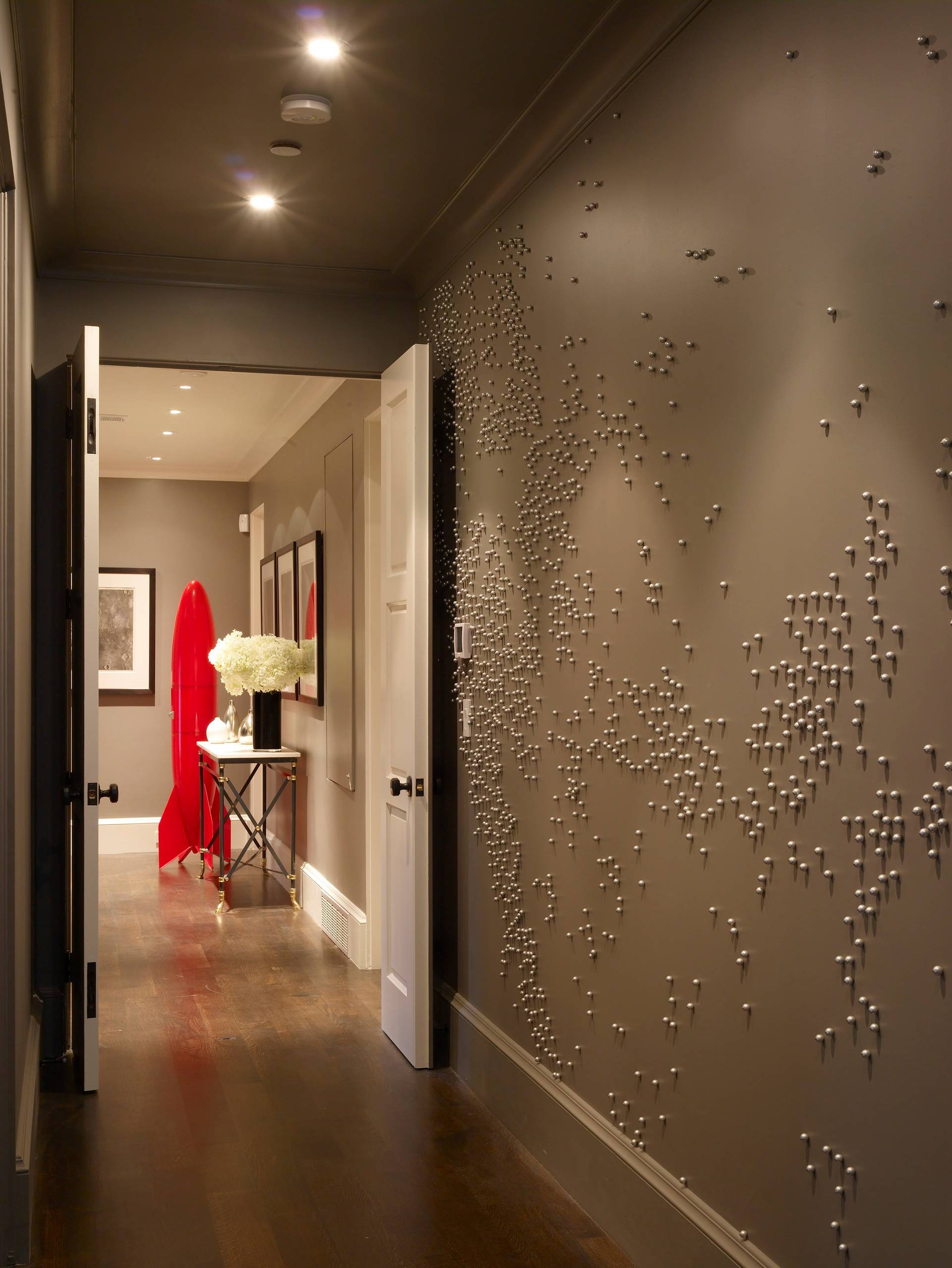 Der er utallige måder at dekorere væggene på i en lang gang – både tapet, maling og spejle kan bløde rummets kedelige udtryk op. Arkitekt Jørgen Knippel foreslår blandt andet store motiver trykt på mega-tapeter som dekoration på væggene, fordi de giver god dynamik til rummet. I gangen på billedet her har man valgt at beklæde en enkelt væg med megatapet og malet de resterende vægge i en neutral grå farve, så den affotograferede skyline får plads i rummet. Derudover anbefaler Jørgen Knippel at hænge spejle op i gangen, fordi de både pynter og med de naturlige genspejlinger får gangen til at virke større.