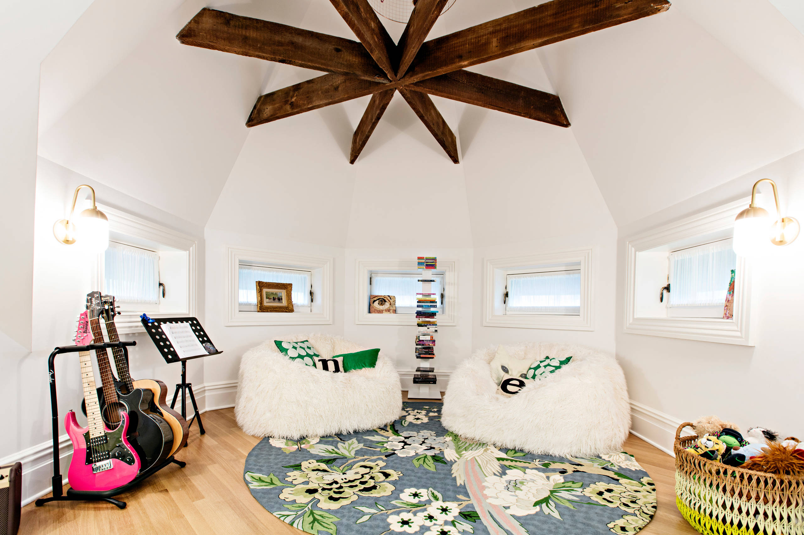 Her er der også skabt en naturlig opdeling i det store rum med træreoler, der blender ind med resten af værelsets indretning.