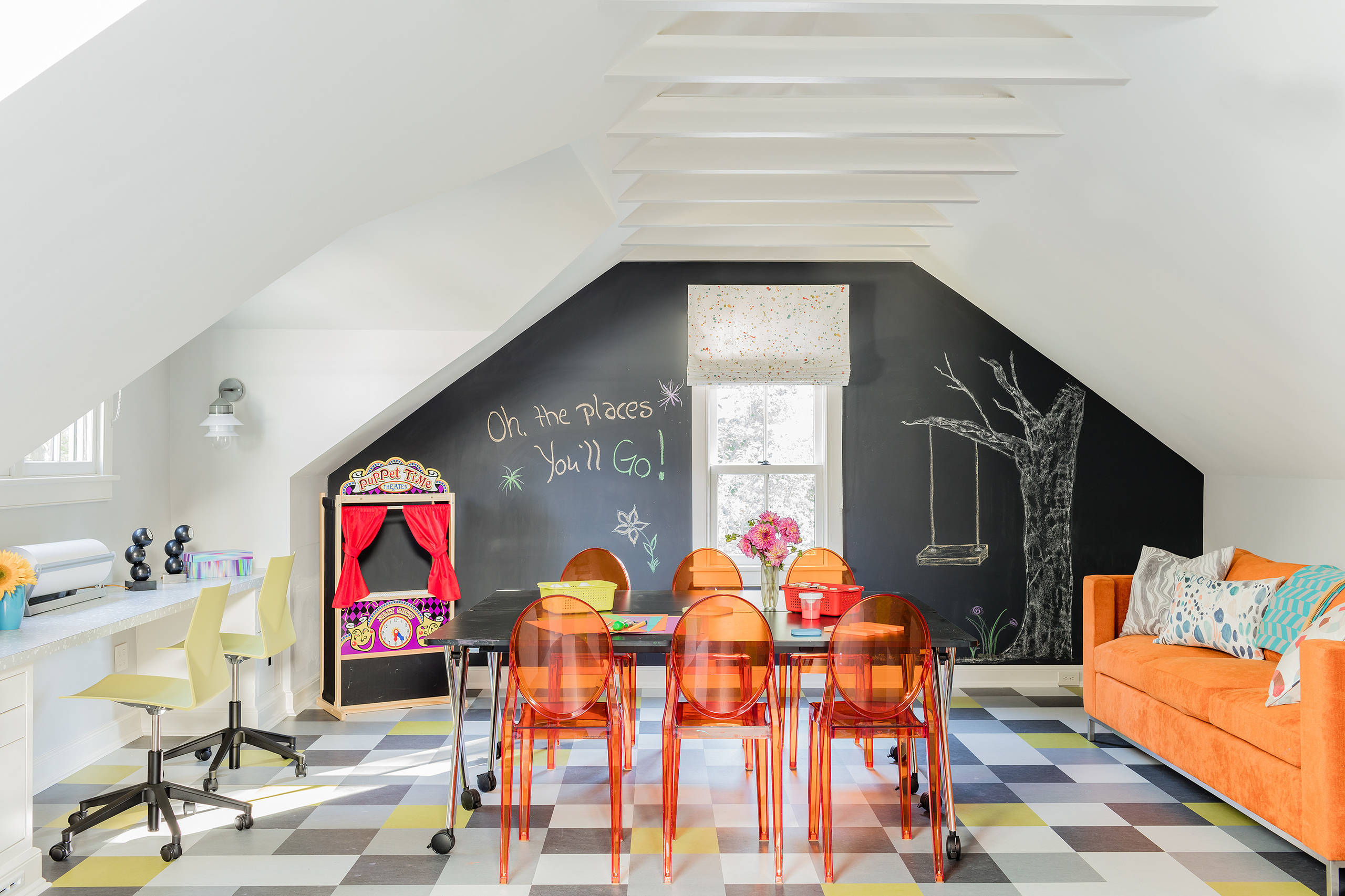Skamler kan også være en god idé til siddepladser, da de nemt kan trækkes ind under under bordet og give plads til leg på gulvet.