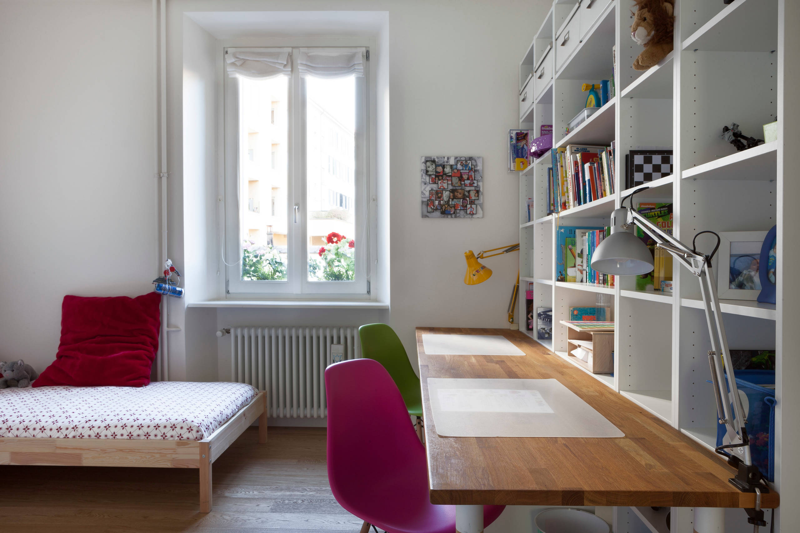 Du kan også inddrage en hel væg fra gulv til loft og at skabe en flot bogreol. Det giver kulør til børneværelset og sætter bøgerne i system.