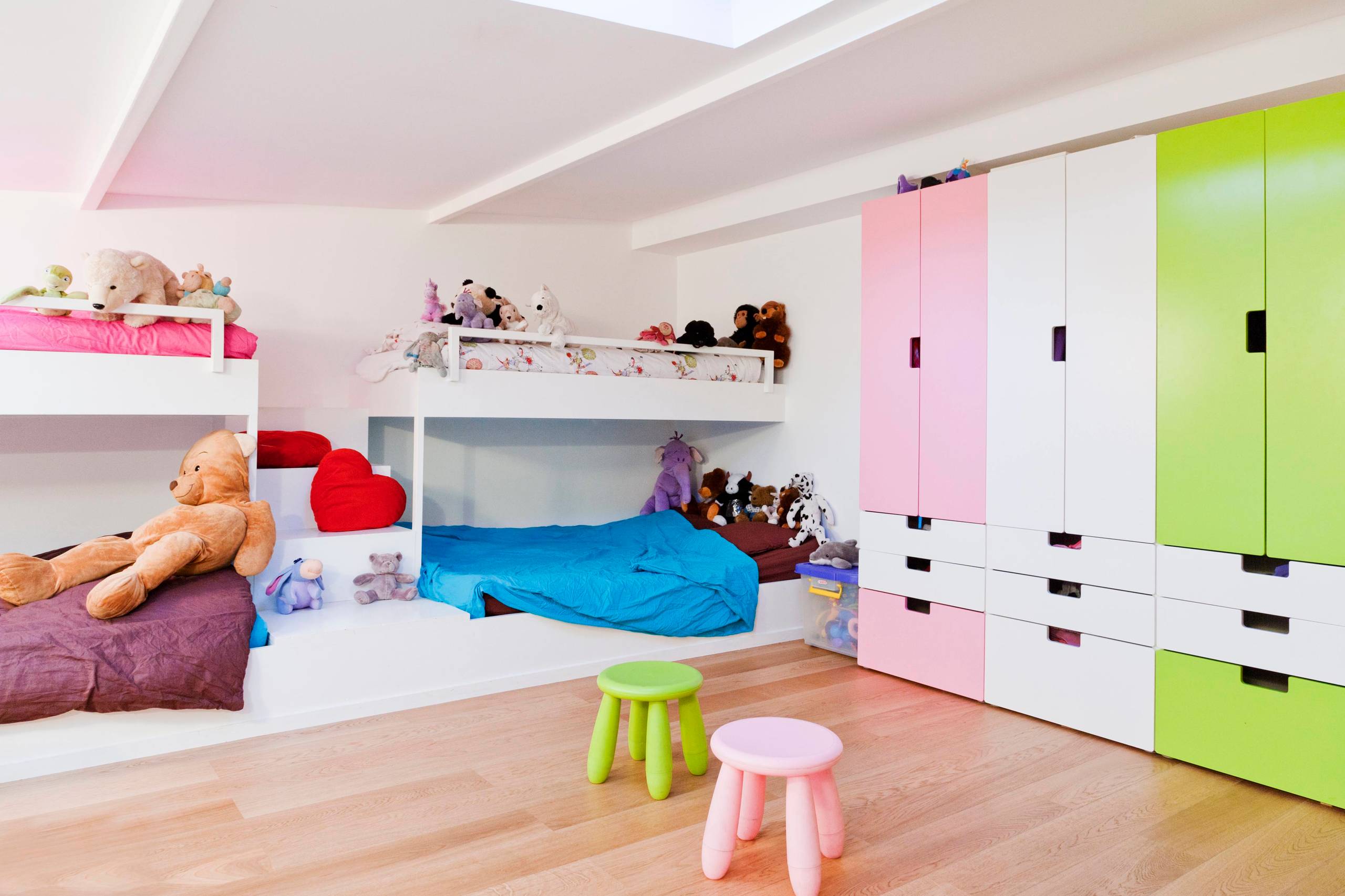 Det samme kan også gøres med børnenes garderobeskabe. Her er det valgt høje smalle garderobeskabe, der ikke fylder ret meget i rummet, når de er placeret lige op ad hinanden.