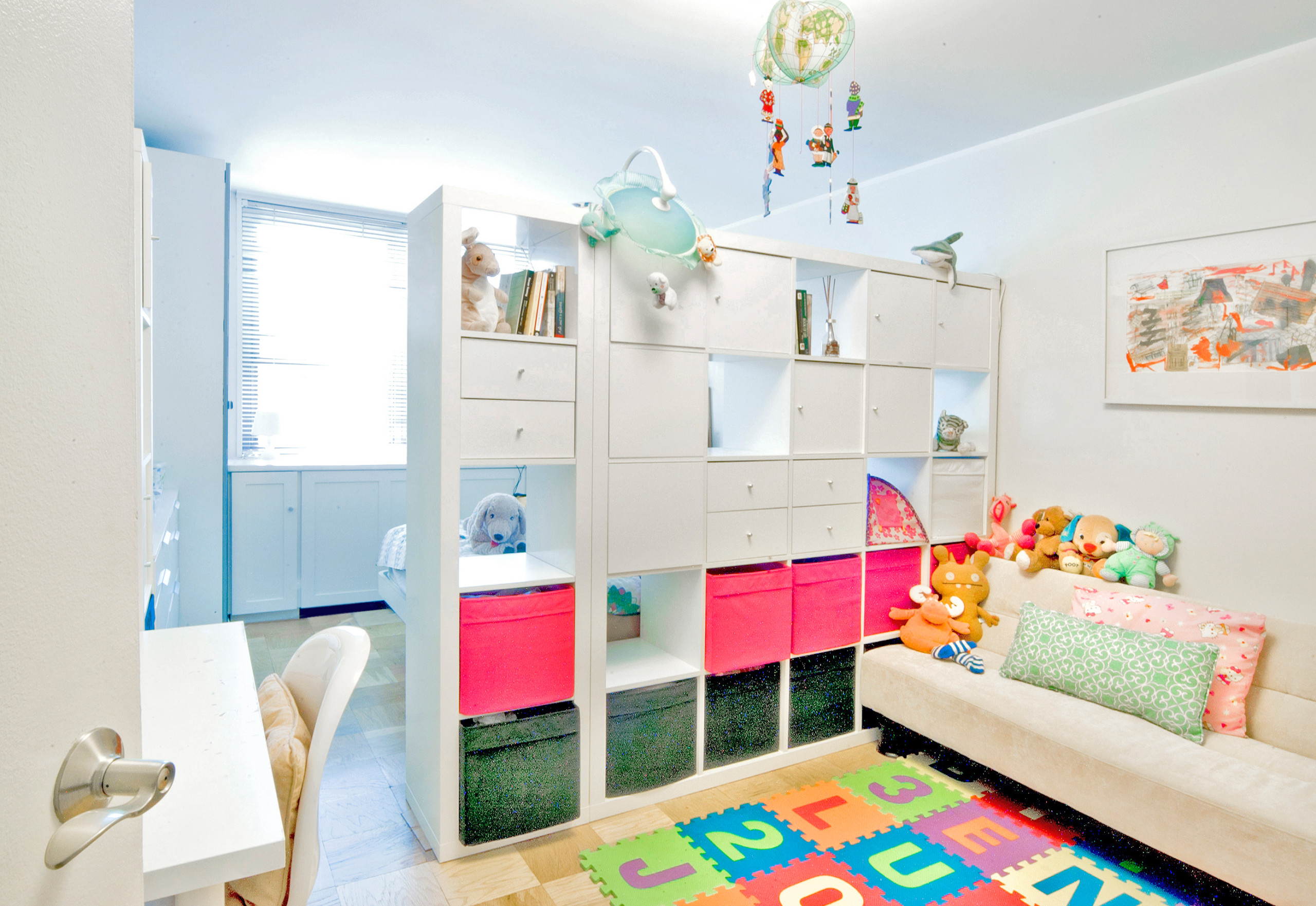 Den største udfordring, du vil støde på, når du skal indrette et deleværelse til dine børn, er formentlig at få plads til alle deres ting. Derfor er det vigtigt at fokusere på at få skabt gode opbevaringsmuligheder, hvis værelset ikke skal virke rodet. Her kan det være en idé at inddrage en hel væg til opbevaring fra gulv til loft. I dette deleværelser er der brugt et reolsystem, der er forholdsvist smalt i bredden, men som udnytter højden med masser af hylder og skabe til legetøj, bøger og spil. Samtidig er det multifunktionelt, da der også er integreret to skrivebordspladser i møblet.