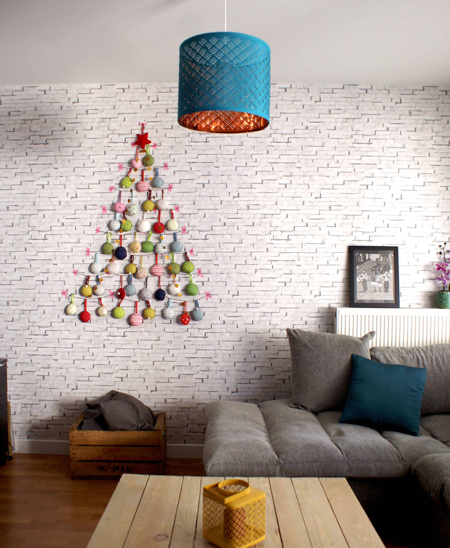 Et super simpelt juletræ med grafiske trekanter pynter væggen i denne stue. Den turkise og den neongule trekant i træet matcher de kulørte farver i rummet.