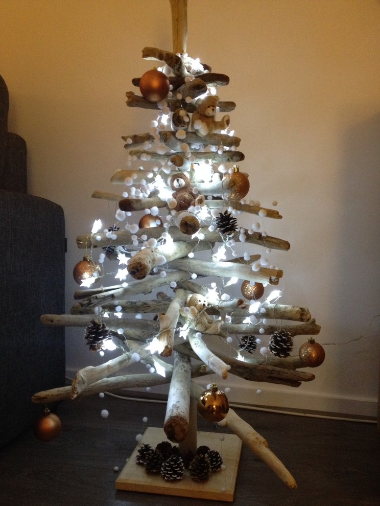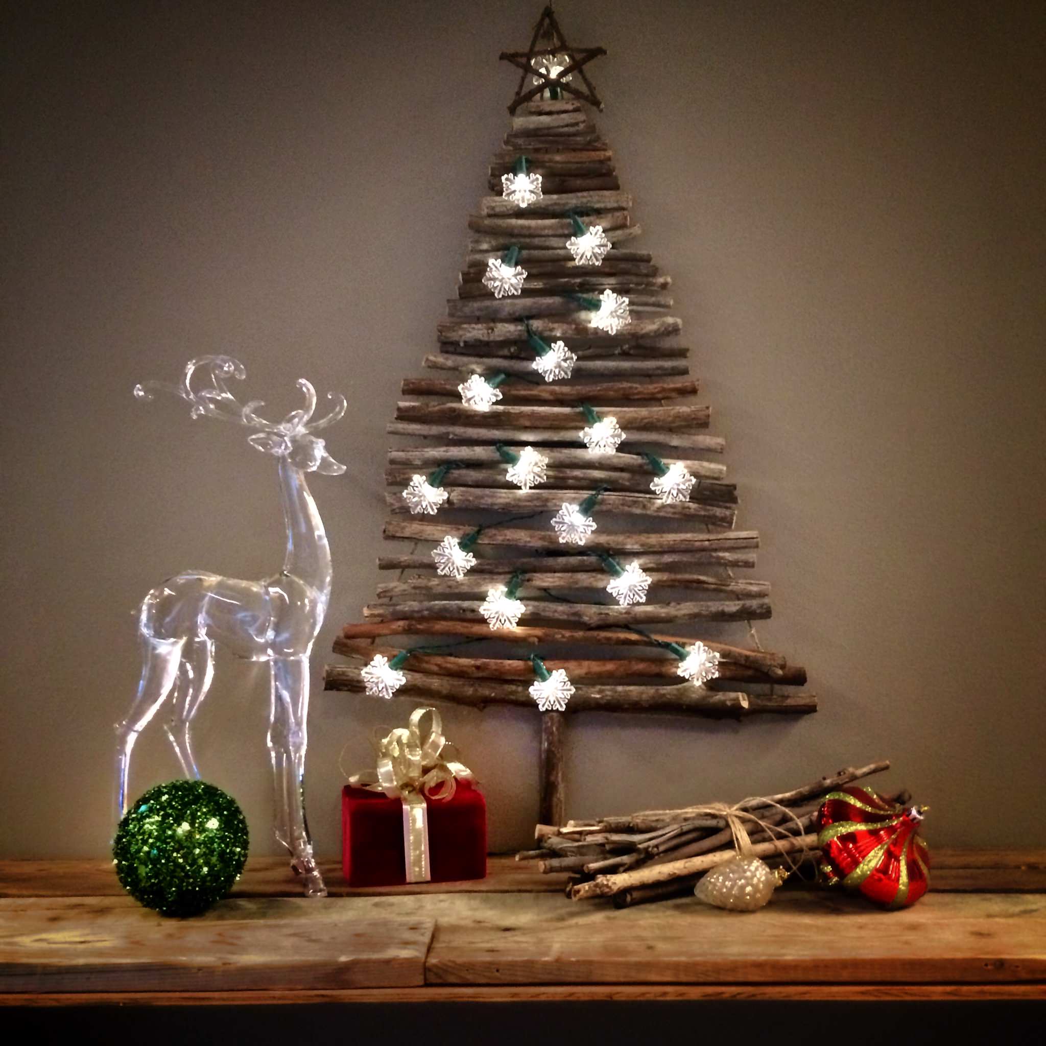 Ligeledes et eksempel på et træ lavet af træpinde, du nemt kan kaste dig over. Sæt pinde med forskellige længer fast på en trekantet ramme, så de tilsammen danner et juletræ. Bind dem fast med ståltråd, og dekorer eventuelt med julelys. Det kan også være en fin udsmykning til din hoveddør eller terasse.