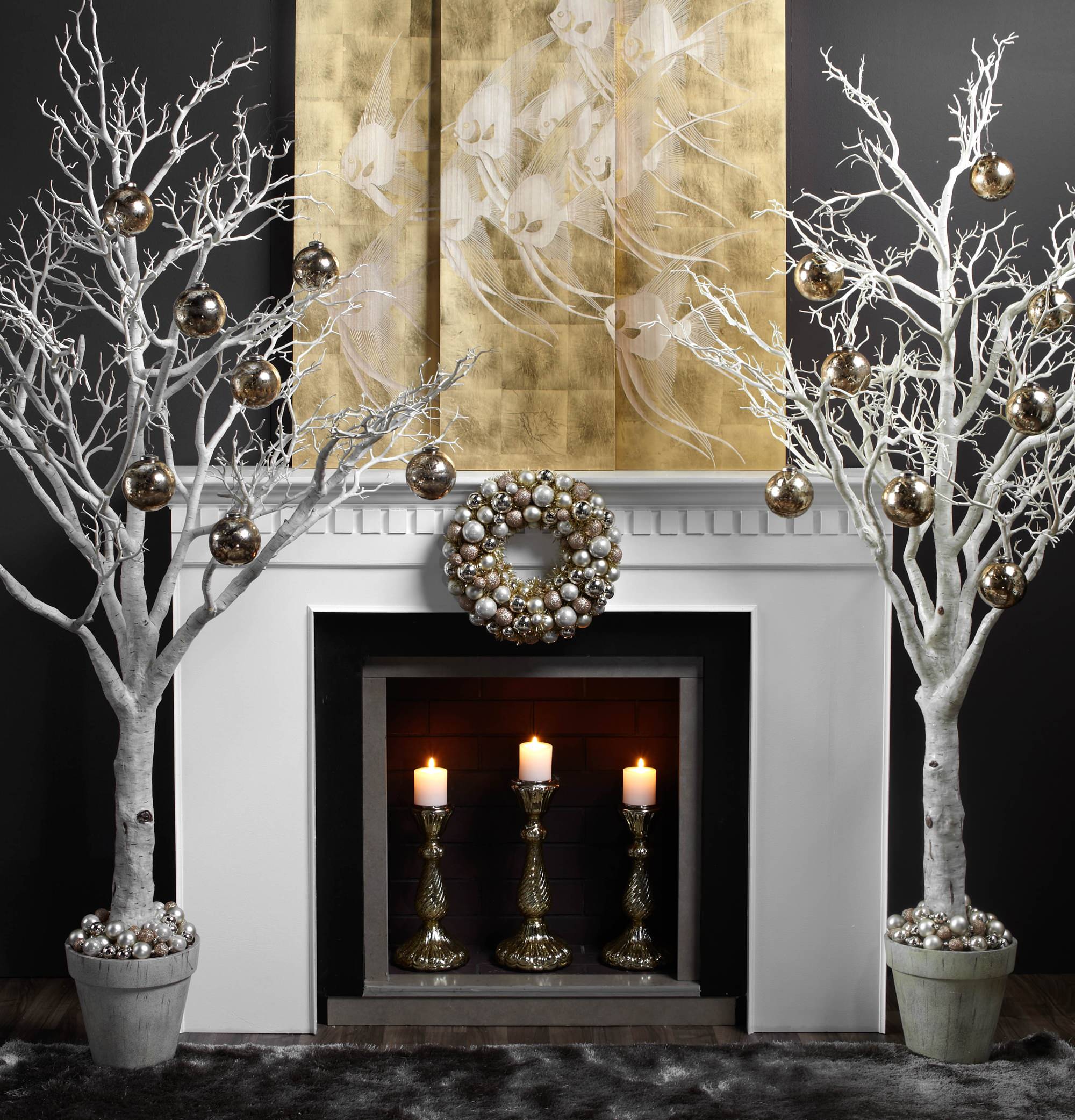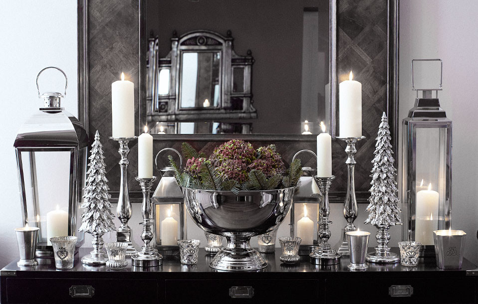 Disse små sølvgrantræer giver en elegant udsmykning på kommoden sammen med sølvlysestager, hvide bloklys og friske blomster.
